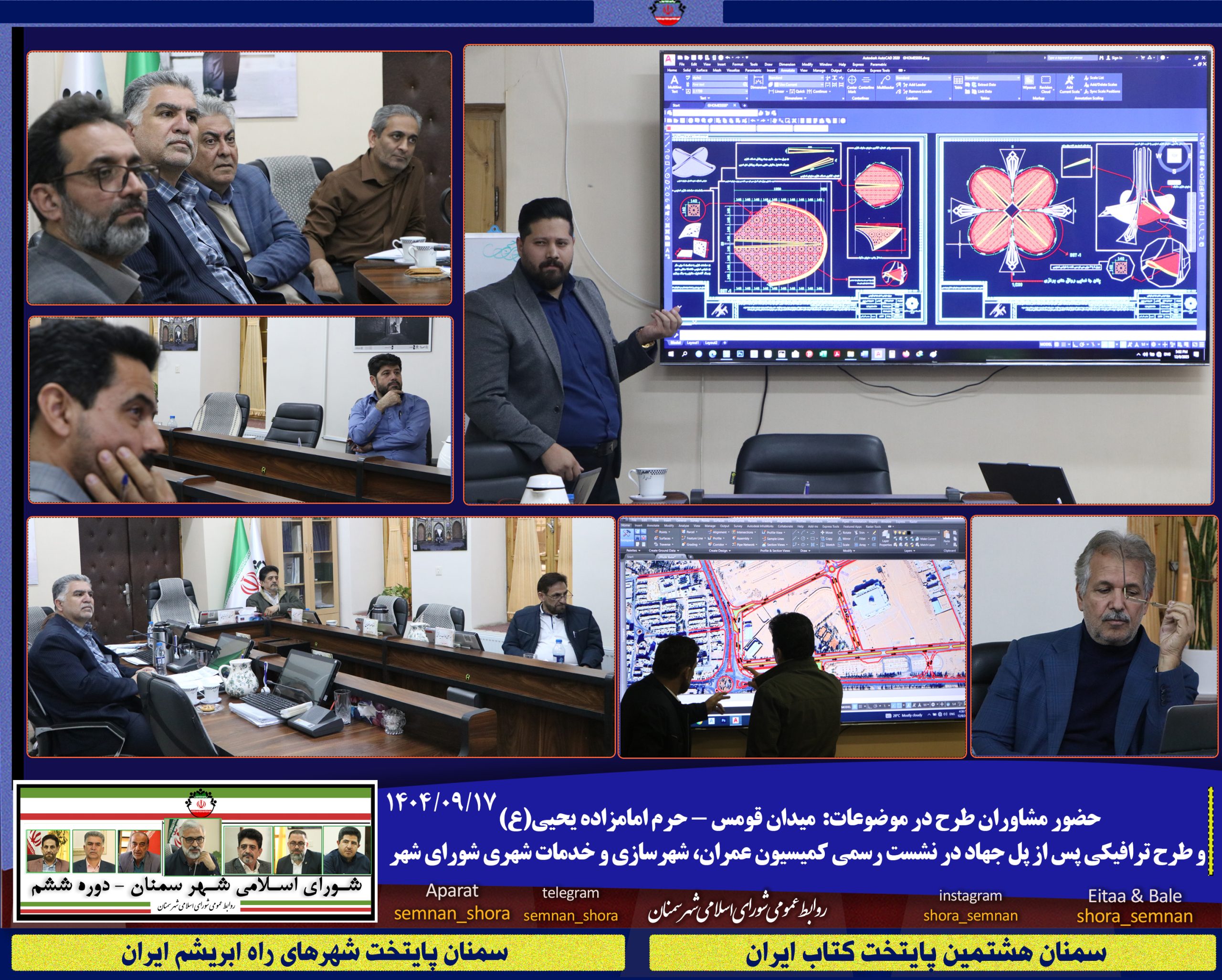 🔹کمیسیون عمران، شهرسازی و خدمات شهری شورای اسلامی شهر سمنان به ریاست مجید نظری سه طرح عمرانی با موضوعات: هنرسازه (المان) میدان قومس، طرح ترافیکی پس از پل جهاد و شهرک ۵۲ هکتاری، طرح توسعهی امامزاده یحیی(ع) را با حضور مهندسان مشاور این طرحها، بررسی کرد.