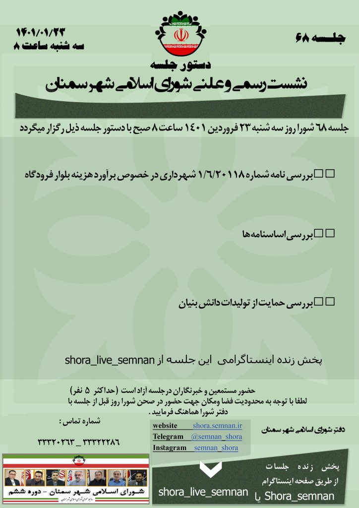 جلسه ۶۸ شورا روز سه شنبه ۲۳ فروردین ۱۴۰۱ ساعت ۸ صبح برگزار میگردد 🔹️بررسی نامه شماره ۱/۶/۲۰۱۱۸ شهرداری در خصوص برآورد هزینه بلوار فرودگاه 🔸️بررسی اساسنامه ها 🔹️بررسی حمایت از تولیدات دانش بنیان