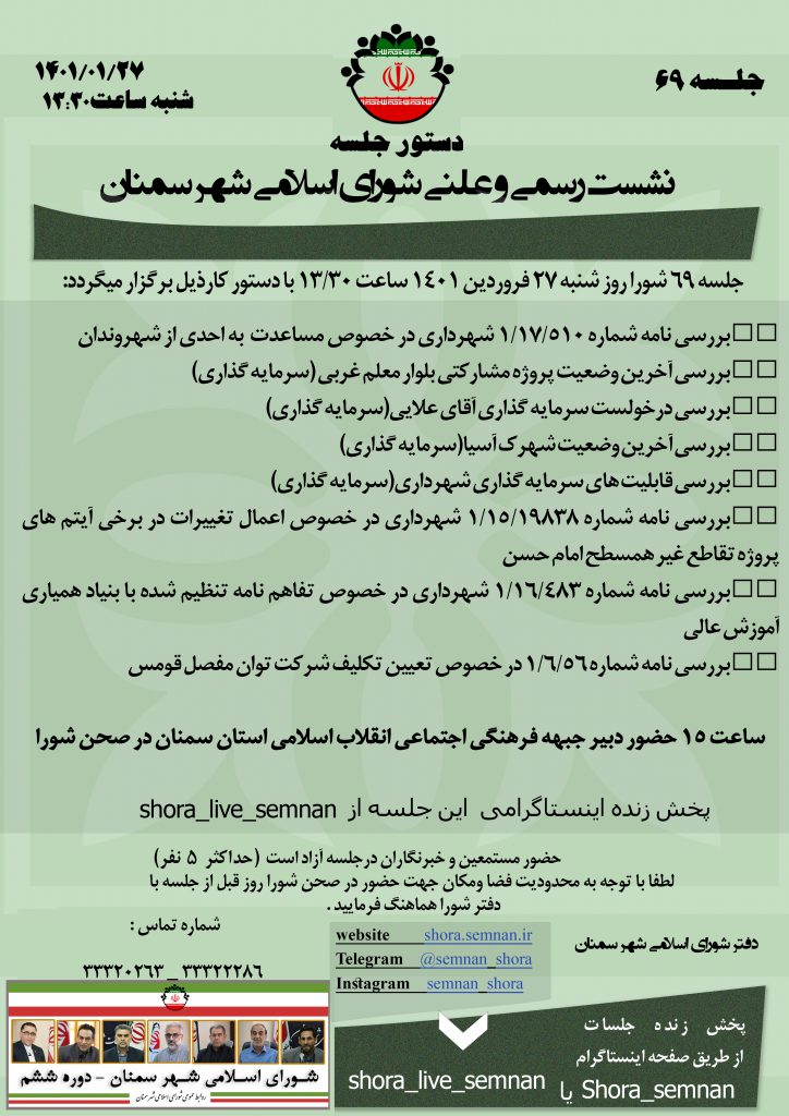 جلسه ۶۹ شورا روز شنبه ۲۷ فروردین ۱۴۰۱ ساعت ۱۳/۳۰ با دستور کارذیل برگزار میگردد: