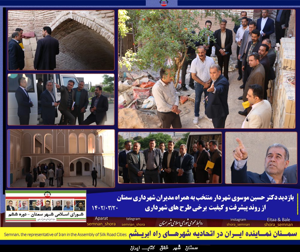 🔸دکتر حسین موسوی شهردار منتخب سمنان در ادامه بازدیدهای میدانی خود روز شنبه بیستم خرداد ۱۴۰۲ با همراهی سرپرست؛معاونان و مدیران شهرداری سمنان از تملک و تعریض خیابان با هنر؛ بازارچه بلوار آیت الله عالمی ؛ طرح توسعه و ایجاد صحن جنوبی حرم امامزاده یحیی(ع)؛ طرح پهنه شرقی مسجد تاریخی امام(ره)؛ خانه قدیمی نصیری یا مهاجر جهادیه؛ مجموعه گردشگری موزه آب (خانه گردشگری بهمن و آب انبار تاریخی قاضی) ،خانه تاریخی خطیبی ها و پل شهید دانشگر(روزیه) بازدید کرد.